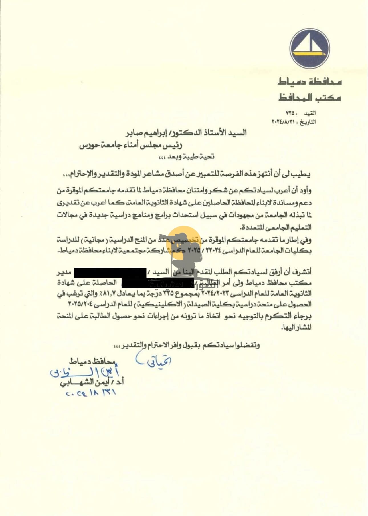 ▪️فى سابقة فريدة تتجاوز حدود القانون و الأخلاق و شروط الوظيفة العامة يستولى موظفين اثنين بديوان عام محافظة دمياط على منحتين دراسيتين لأبنائهما ليحجبانها عن عموم المستحقين من أبناء محافظة دمياط الذين تنبطق عليهم شروط المنحة، والذى ثبت ذلك بموجب كتابين موقعين من محافظ دمياط _حديث العهد بالمحافظة و بالحكم المحلى _ موجهين للسيد الأستاذ الدكتور إبراهيم صابر رئيس مجلس أمناء جامعة حورس، و ذلك بالمخالفة للبروتوكول المحدد بين المحافظة و الجامعة و المعلن من المحافظة على صفحتها الرسمية بتاريخ ٧ سبتمبر ٢٠٢٤ متضمنا الشروط الآتية :-
