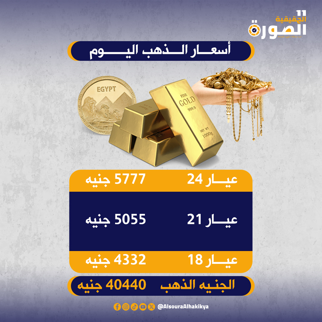 - الذهب عيار 24: وصل إلى 5777.25 جنيه للبيع و 5748.5 جنيه للشراء.
