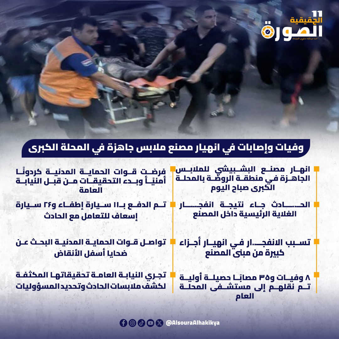 شهدت المنطقة الصناعية بالروضة في المحلة الكبرى بمحافظة الغربية حادثًا مأساويًا صباح اليوم الجمعة، تمثل في انهيار مصنع البشبيشي للملابس الجاهزة، وذلك إثر انفجار الغلاية الرئيسية داخل المصنع. وقد أسفر الحادث عن خسائر بشرية ومادية فادحة، فيما تواصل الأجهزة المعنية جهودها لإنقاذ الضحايا والتعامل مع تداعيات الواقعة.
