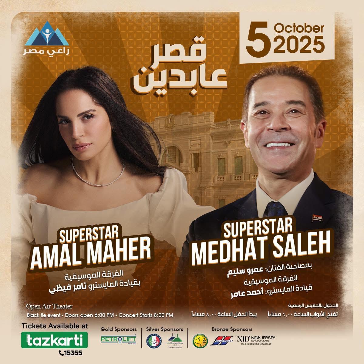 يحيى الفنان مدحت صالح والفنانة آمال ماهر حفلا غنائيا خيريا بمصاحبة الأوركسترا المصاحبة لهما، غدا بقصر عابدين لصالح مؤسسة راعي مصر عضو التحالف الوطنى للعمل الأهلى التنموى وذلك بحضور ورعاية وزيرة التضامن الاجتماعي الدكتورة مايا مرسي