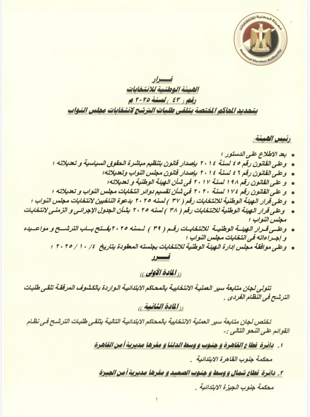 تبدأ مجموعة من المحاكم الابتدائية في جميع أنحاء مصر غدًا الأربعاء في استقبال طلبات الترشح لانتخابات مجلس النواب 2025، وذلك وفقًا للجدول الزمني الذي أقرته الهيئة الوطنية للانتخابات. وقد أصدرت الهيئة قرارًا تنظيميًا يحدد آليات ومقار تلقي الطلبات لمرشحي النظام الفردي ونظام القوائم، بهدف ضمان سير العملية بانتظام على مستوى الجمهورية.