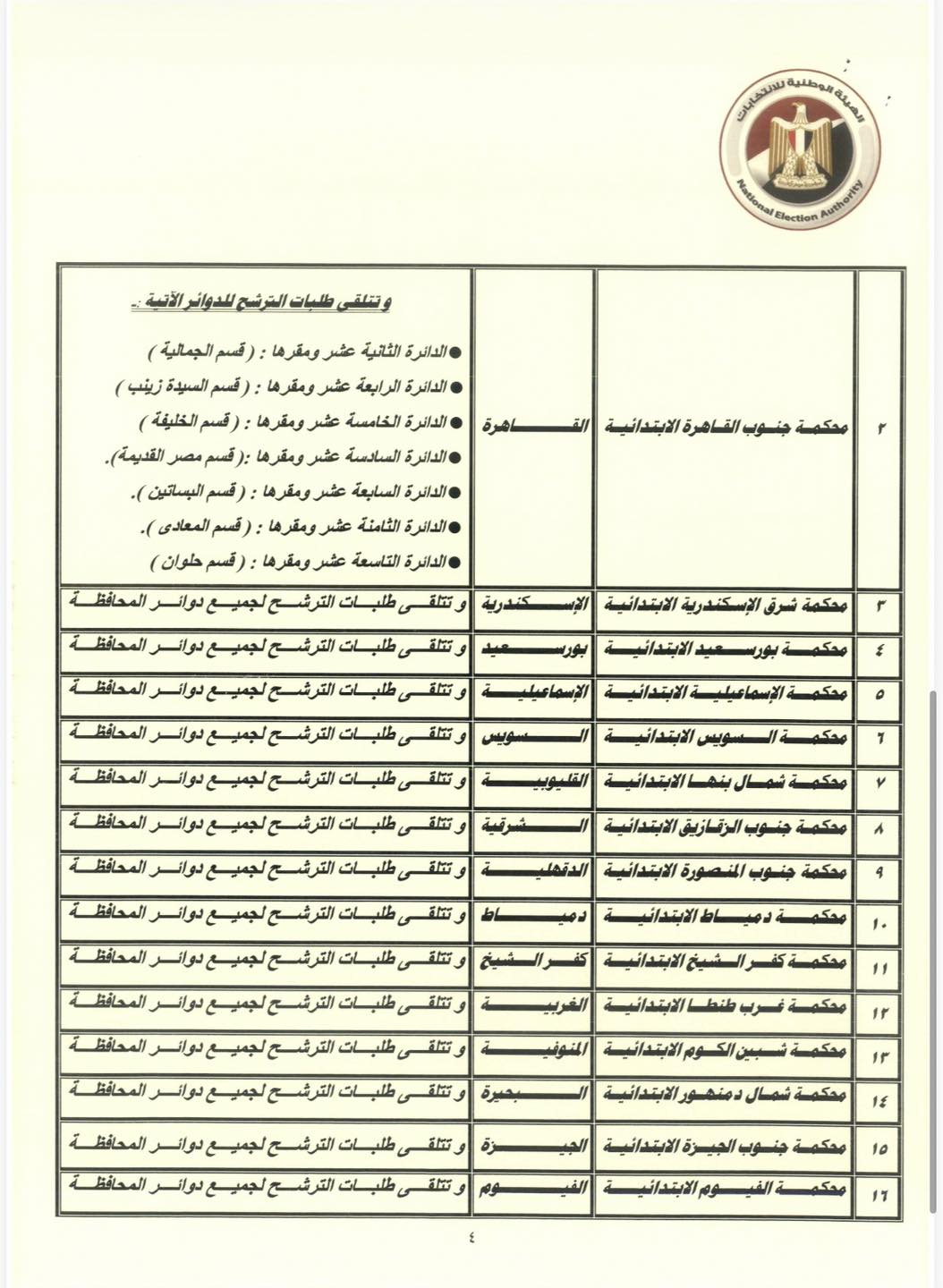 الجدير بالذكر أن بعض المحاكم، مثل محكمة شمال القاهرة الابتدائية، تتولى تلقي طلبات الترشح لنحو 12 دائرة فردية بمحافظة القاهرة، تشمل دوائر الساحل، روض الفرج، الزاوية الحمراء، الزيتون، حدائق القبة، أول مدينة نصر، التجمع الخامس، أول السلام، عين شمس، المطرية، المرج، والظاهر، بينما تتولى محاكم أخرى كـمحكمة بورسعيد والإسماعيلية الابتدائية تلقي طلبات جميع دوائر المحافظة التابعة لها.
