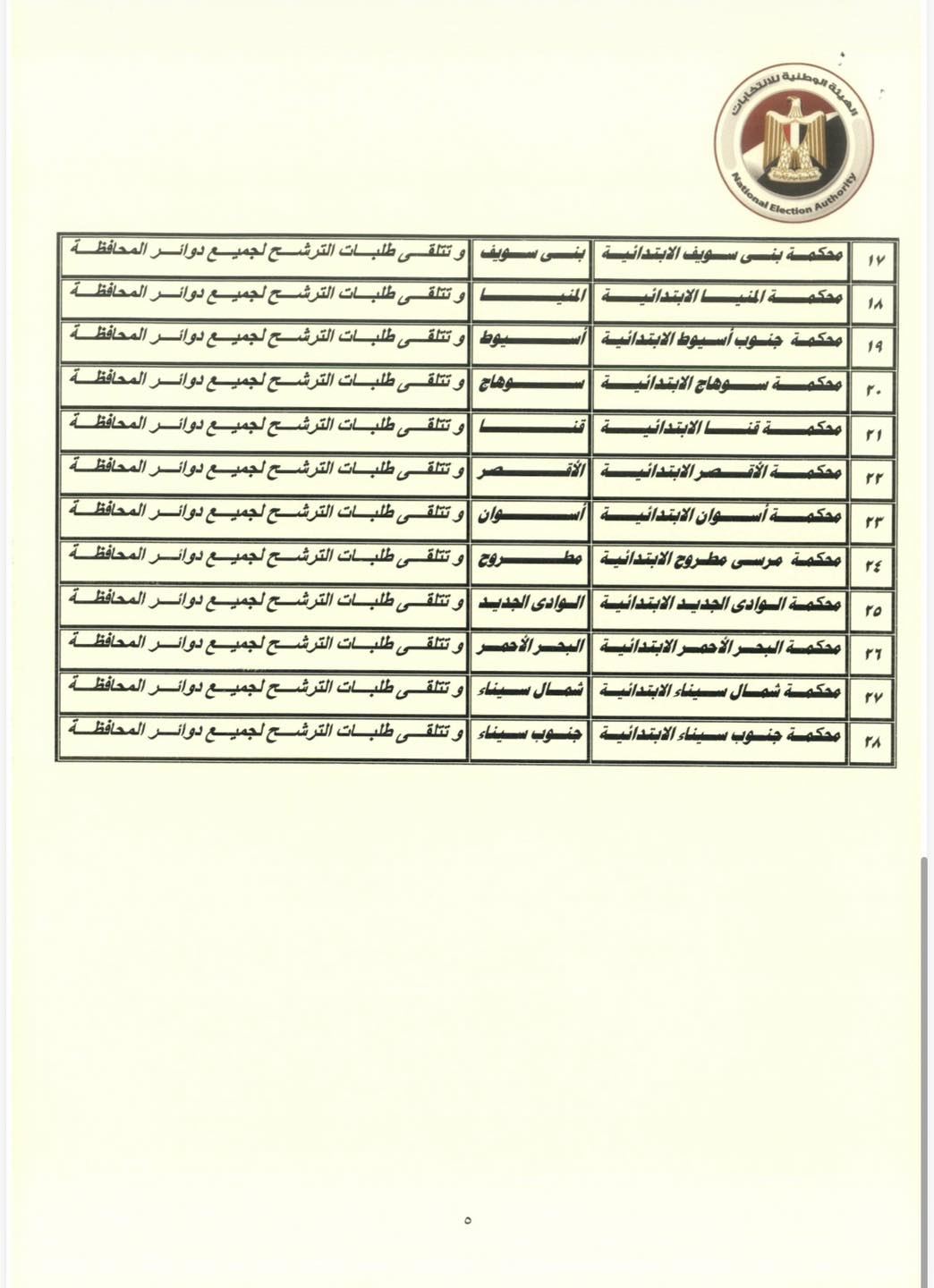 أعلنت الهيئة الوطنية للانتخابات أن لجان متابعة سير العملية الانتخابية في 28 محكمة ابتدائية ستتولى استقبال طلبات المرشحين عن النظام الفردي. وتشمل هذه المحاكم: