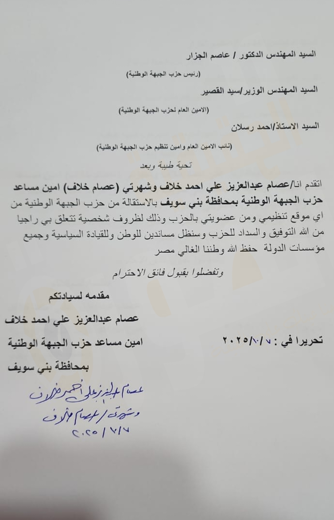 خاص وحصري.. استقالة اللواء عصام خلاف أمين مساعد حزب الجبهة الوطنية في بني سويف