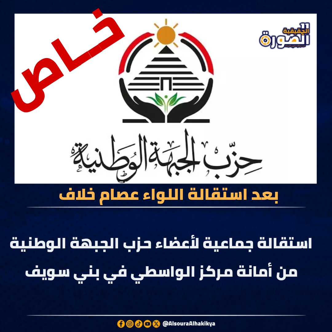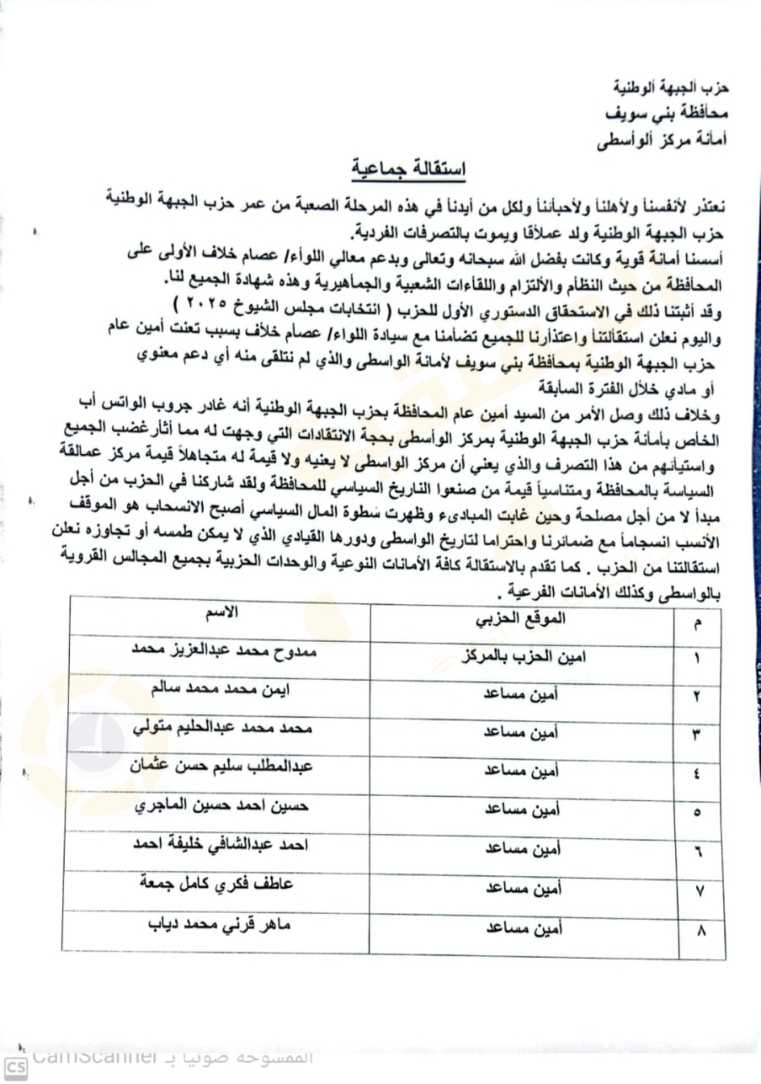 أصدرت أمانة مركز الواسطى بياناً جماعياً بعنوان “استقالة جماعية”، أكدت فيه أنها اتخذت قرارها تضامناً مع اللواء عصام خلاف، وكشفت عن خلافات داخلية مع الأمين العام للحزب بالمحافظة.