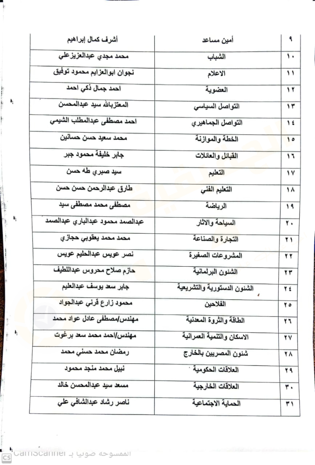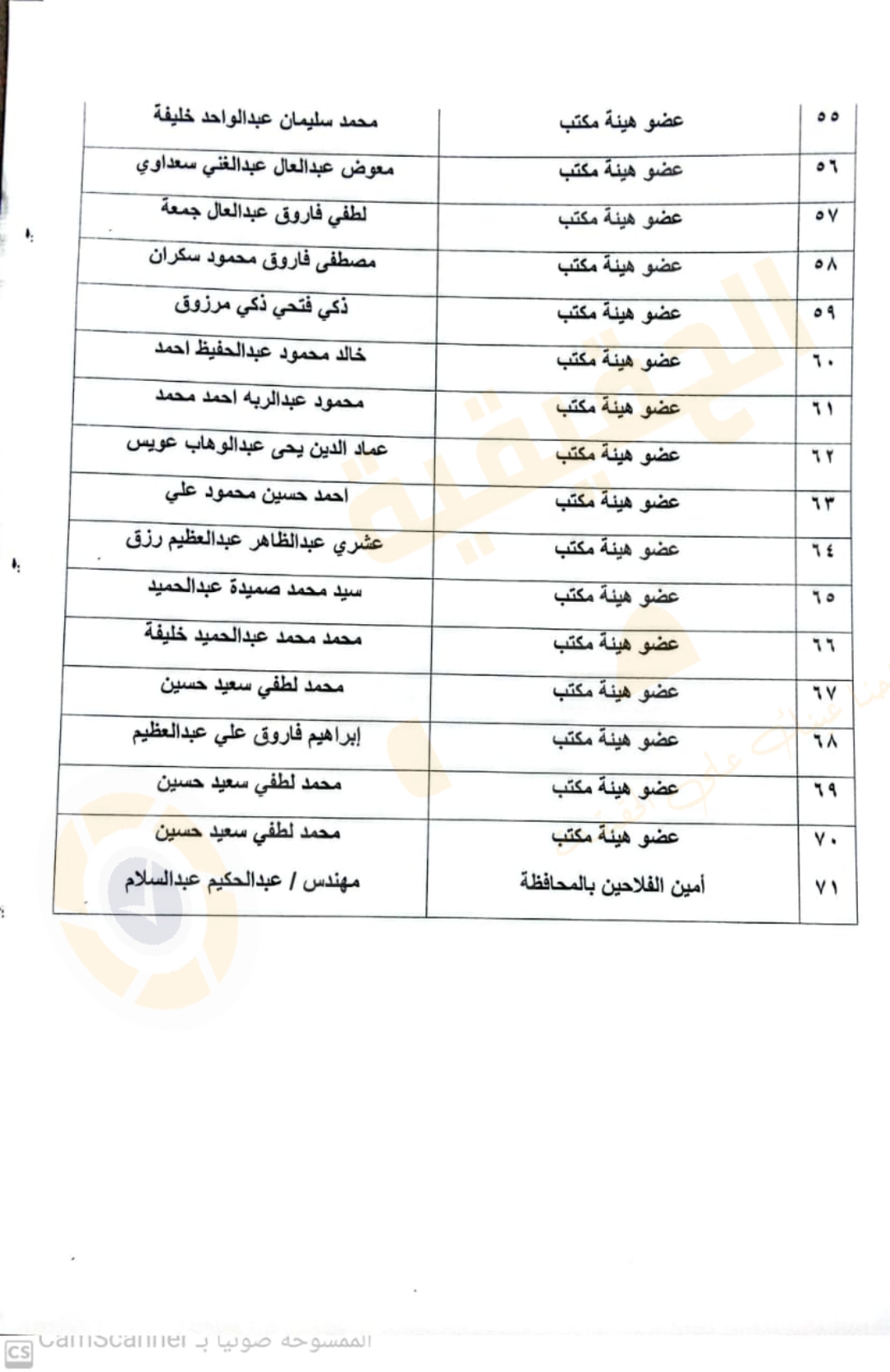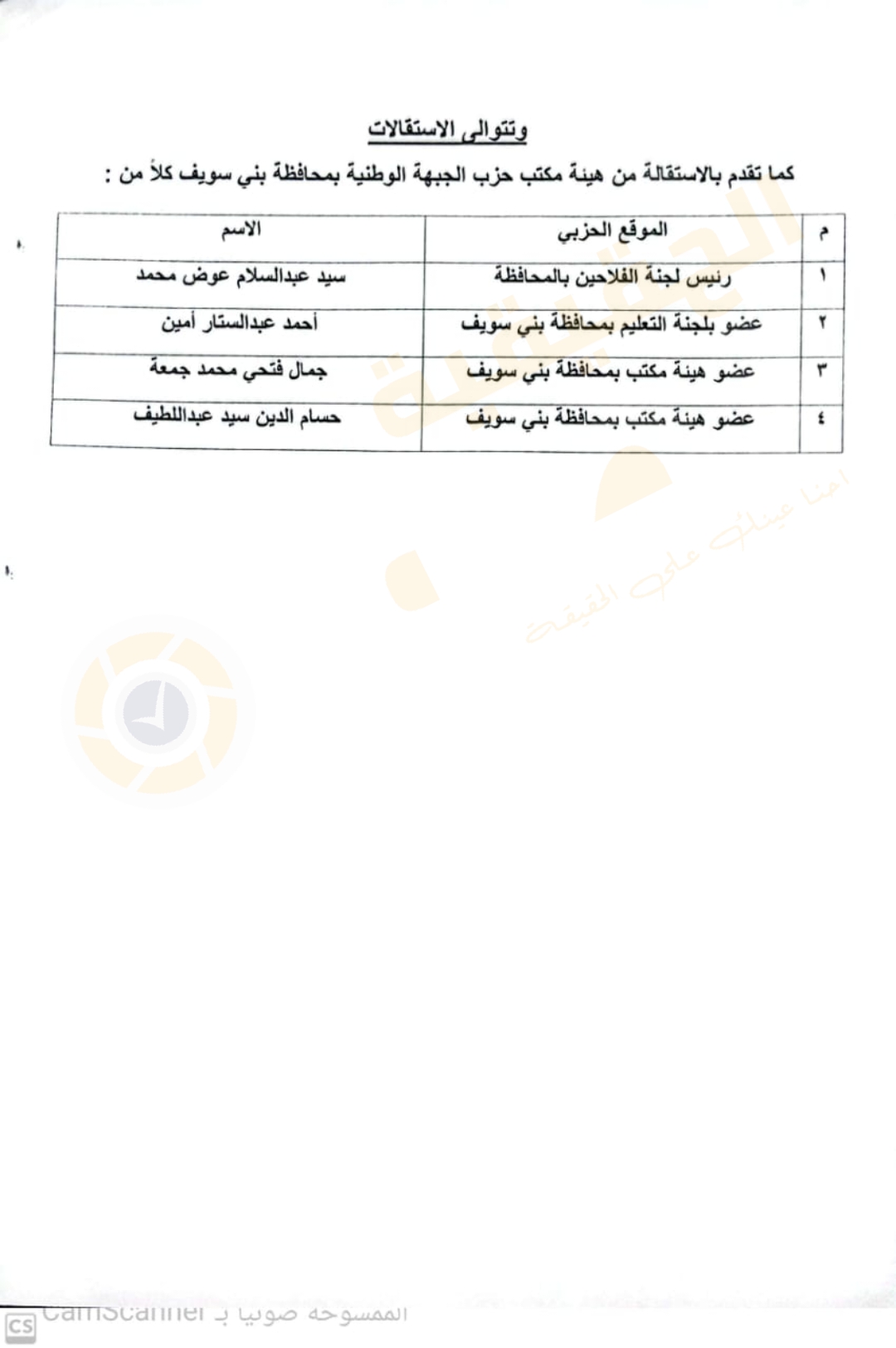 وتم إرفاق قائمة بأسماء القيادات الثمانية المستقيلة من أمانة المركز ومناصبهم، وفي مقدمتهم ممدوح محمد عبدالعزيز محمد، أمين الحزب بالمركز، وسبعة أمناء مساعدين آخرين.