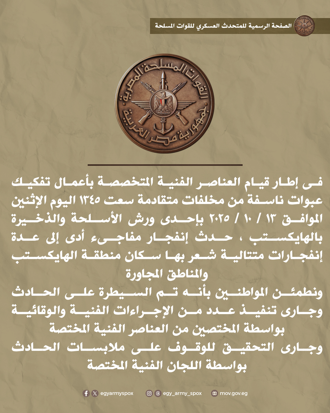 أعلن المتحدث العسكري اليوم الإثنين الموافق 13 أكتوبر 2025، عن وقوع عدة انفجارات متتالية في إحدى ورش الأسلحة والذخيرة بمنطقة الهايكستب.
