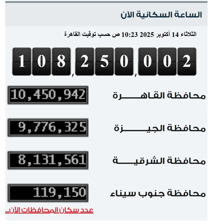 كشف الجهاز المركزي للتعبئة العامة والإحصاء اليوم عن وصول عدد سكان مصر بالداخل إلى 108 مليون و250 ألف نسمة. ويُظهر هذا الرقم زيادة قدرها 250 ألف نسمة خلال فترة 60 يومًا فقط، مقارنة بتسجيل 108 مليون نسمة في منتصف أغسطس الماضي.