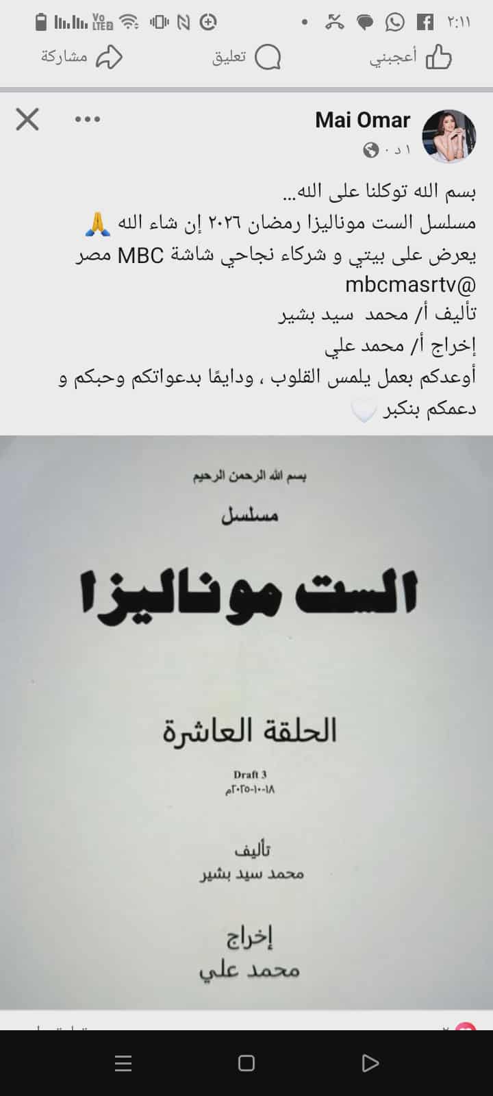 وكتبت مي عمر في منشورها: “بسم الله توكلنا على الله… مسلسل الست موناليزا رمضان ٢٠٢٦ إن شاء الله يُعرض على بيتي وشركاء نجاحي شاشة MBC مصر”، مرفقة صورة لغلاف سيناريو الحلقة العاشرة من المسلسل.