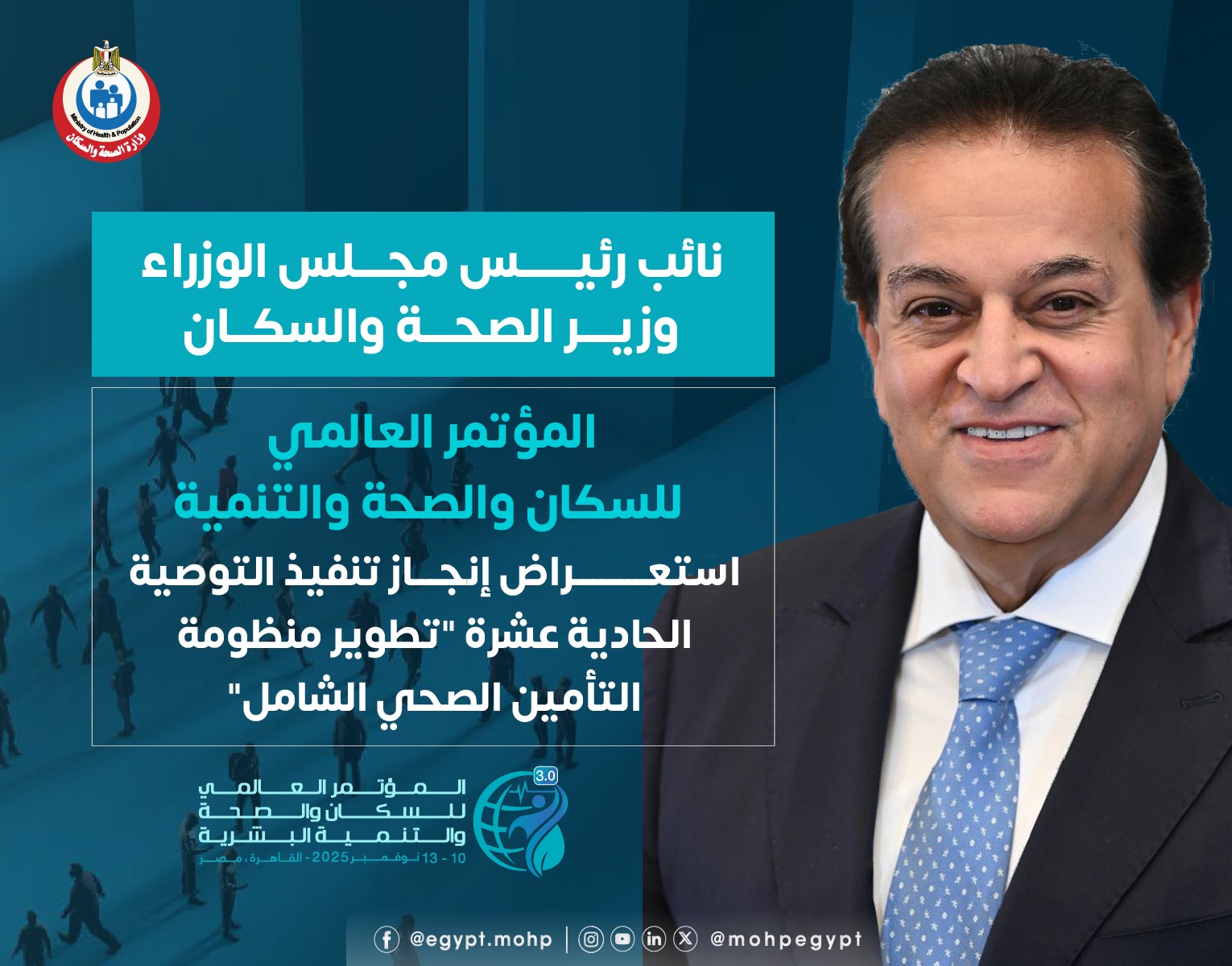أعلنت وزارة الصحة والسكان الإنجازات التي تحققت في تنفيذ التوصية الحادية عشرة الخاصة باستكمال منظومة التأمين الصحي الشامل، ضمن توصيات النسخة الثانية من المؤتمر العالمي للسكان والصحة والتنمية البشرية لعام 2024، وذلك قبيل انطلاق النسخة الثالثة من المؤتمر لهذا العام “PHDC’25”.