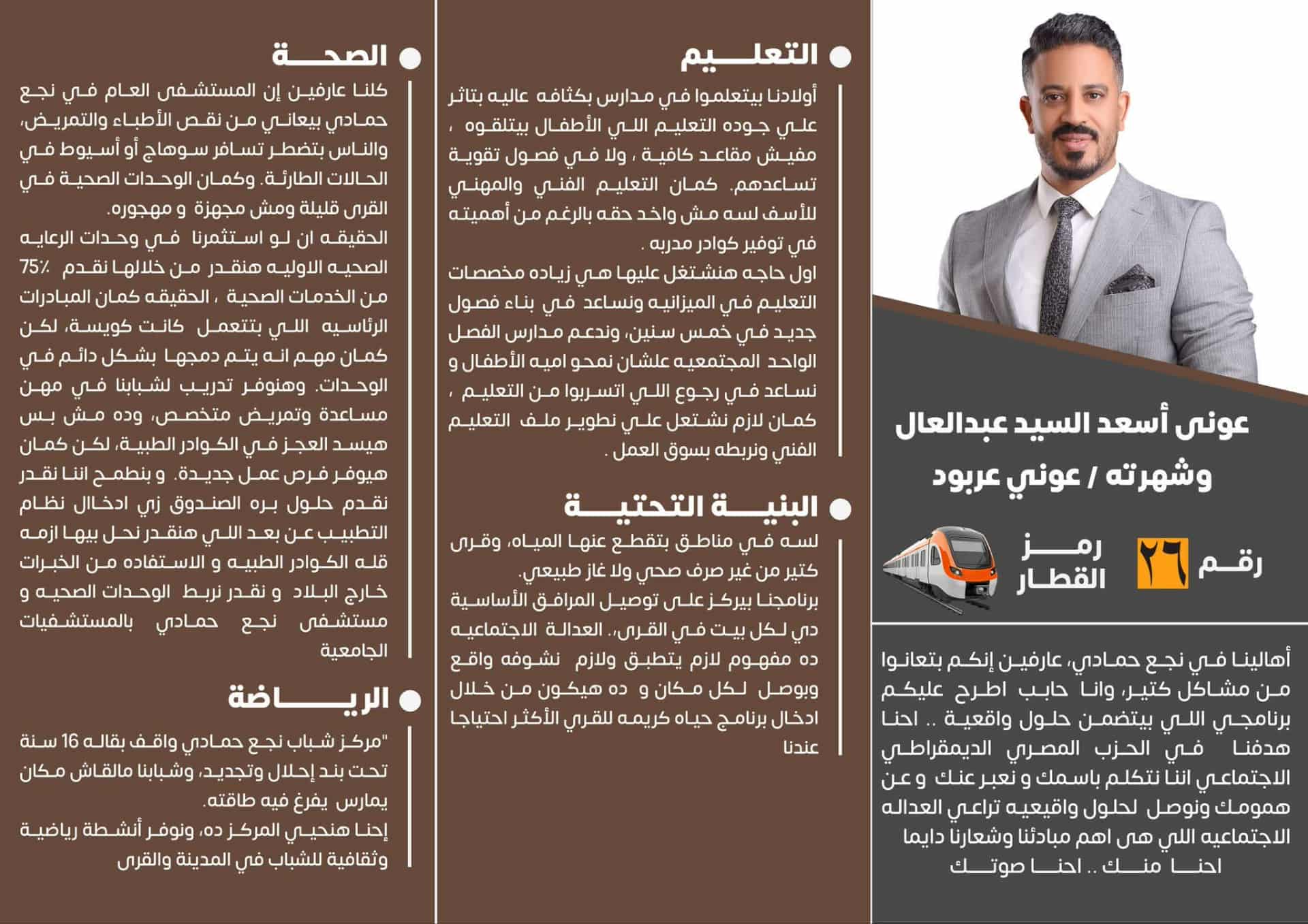 ووجه عوني عربود، مرشح انتخابات مجلس النواب عن دائرة دشنا ونجع حمادي والوقف، رسالة مهمة لأهالي الدائرة، بأهمية المشاركة في العملية الانتخابية واختيار من يمثل ويلبي طلباتهم المشروعة في توفير حياة كريمة، بعيدا عن اي توجهات، مؤكدا أن الشارع النجعاوي يتمتع بقدر كبير من الوعي السياسي والانتخابي الذي تمكنه من اختيار الوجهة التشريعية.