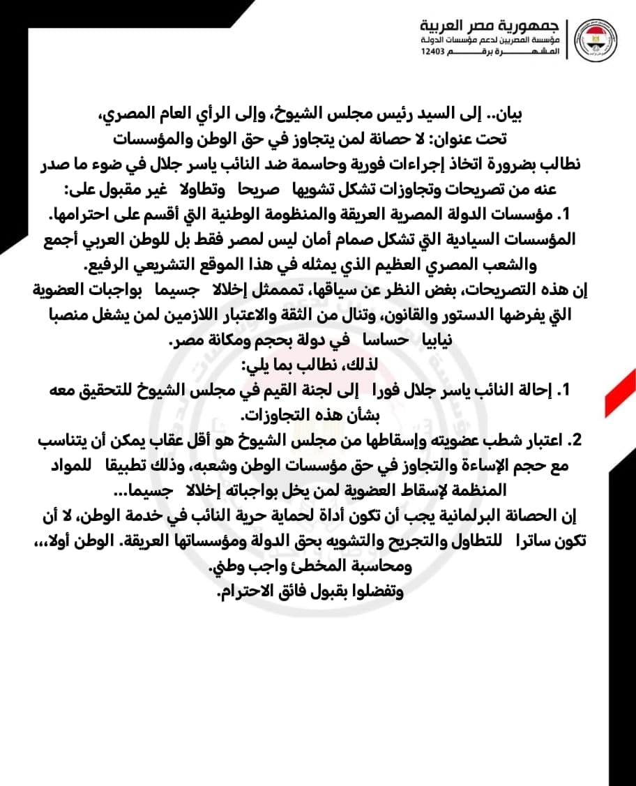 ودعا البيان إلى إحالة النائب ياسر جلال فوراً إلى لجنة القيم بمجلس الشيوخ للتحقيق معه بشأن ما صدر عنه من تجاوزات، مؤكدًا أن إسقاط عضويته يُعد أقل عقوبة تتناسب مع حجم الإساءة الموجهة إلى مؤسسات الدولة والشعب المصري.