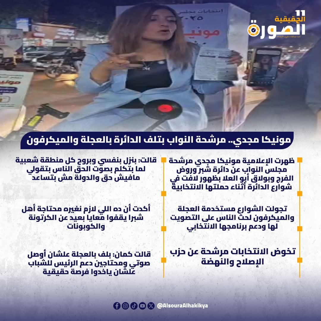 جابت مونيكا مجدي، مرشحة حزب الإصلاح والنهضة عن دائرة شبرا وروض الفرج وبولاق أبو العلا، شوارع الدائرة بدراجتها الهوائية في جولات ميدانية يومية لاقت تفاعلاً كبيرًا على منصات التواصل الاجتماعي، باعتبارها واحدة من أبرز الظواهر الانتخابية في المرحلة الثانية من انتخابات مجلس النواب 2025.