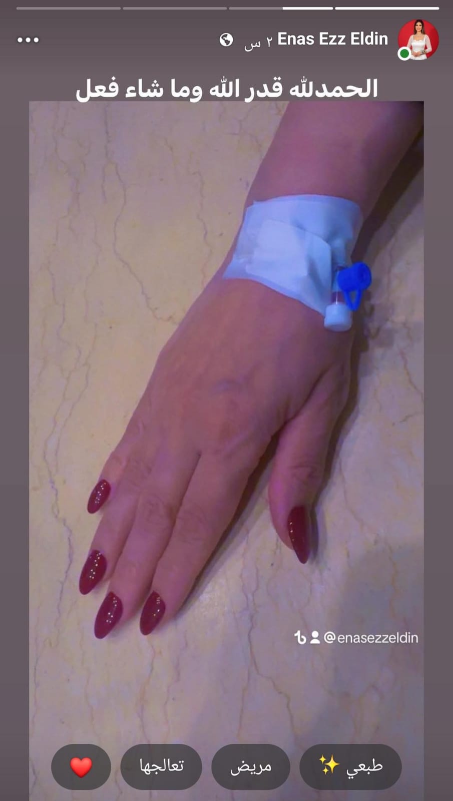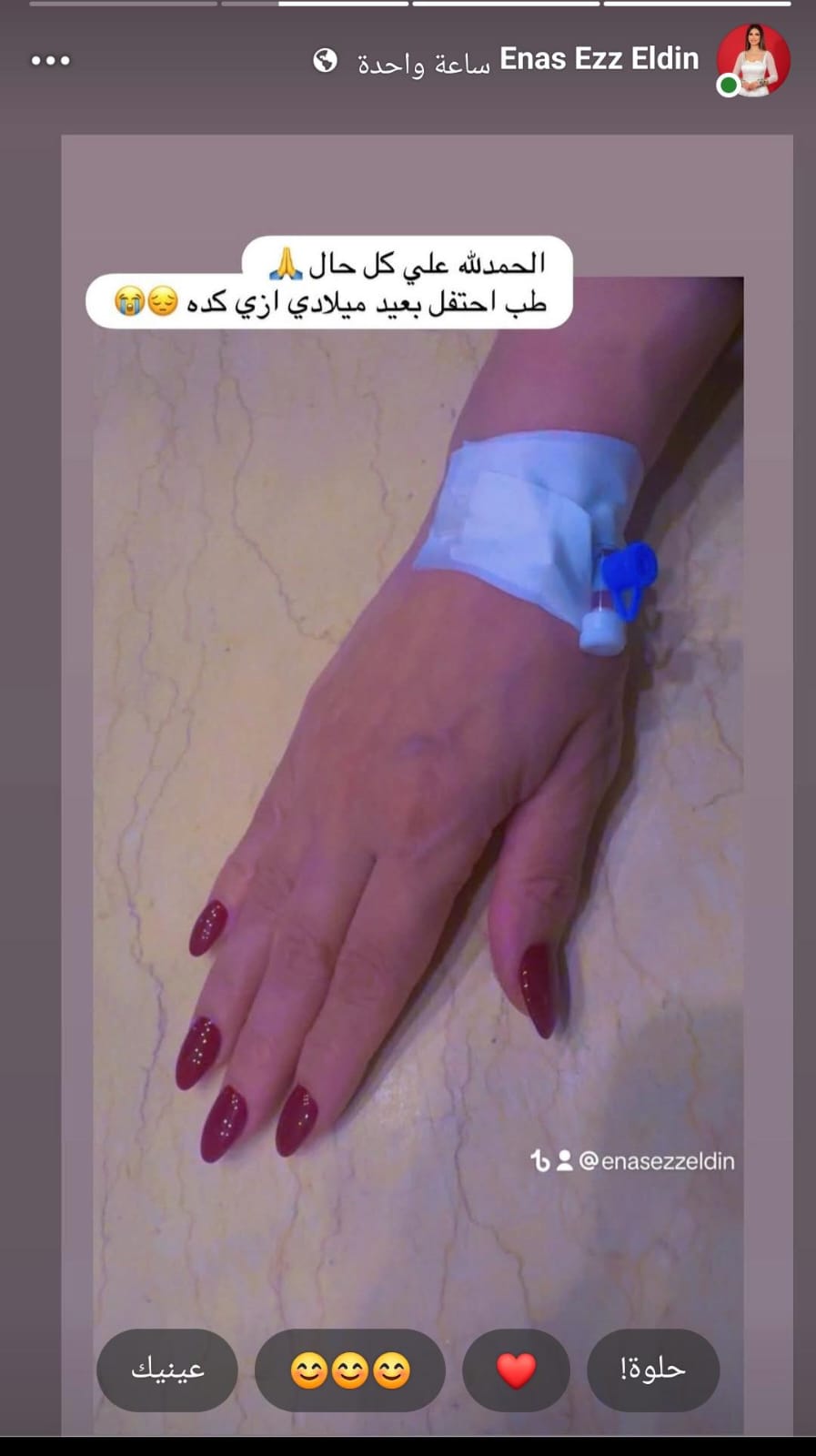 وقالت النجمة والفنانة ايناس عز الدين أول تعليق لها عبر صفحتها الشخصية موقع التواصل الإجتماعي فيس بوك ومغادرتها المستشفى: “الحمد الله علي كل حال طب احتفل ازاي بعيد ميلادي كده، الحمد لله قدر الله ماشاء فعل.