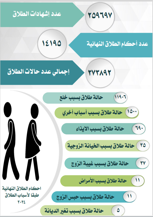 بلغ الإجمالي النهائي لأحكام الطلاق الصادرة بنهاية عام 2024 نحو 14,195 حكمًا نهائيًا. وتظهر البيانات أن 11,906 حالة طلاق من هذا الإجمالي كانت بسبب الخلع، أي ما يمثل نسبة تتجاوز 84% من جميع الأحكام النهائية للطلاق.