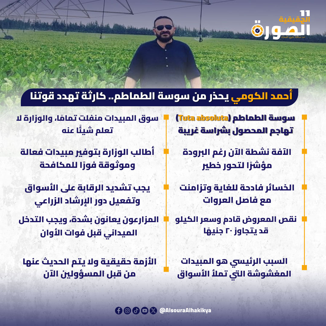 أكد المهندس الكومي أن الآفة تتسبب في خسائر فادحة حيث تقوم بـ “ثقب” الثمرة فورًا، مما يتسبب في إتلافها بالكامل. وتأتي هذه الأزمة في وقت حرج يتزامن مع “فاصل العروات” الزراعية، مما يعني أن استمرار الهجوم سيؤدي حتمًا إلى نقص شديد وكبير جدًا في المعروض من الطماطم في الأسواق خلال الفترة القادمة، محذرًا من أن هذا النقص قد يدفع بسعر كيلو الطماطم إلى تجاوز الـ 20 جنيهًا بسهولة.