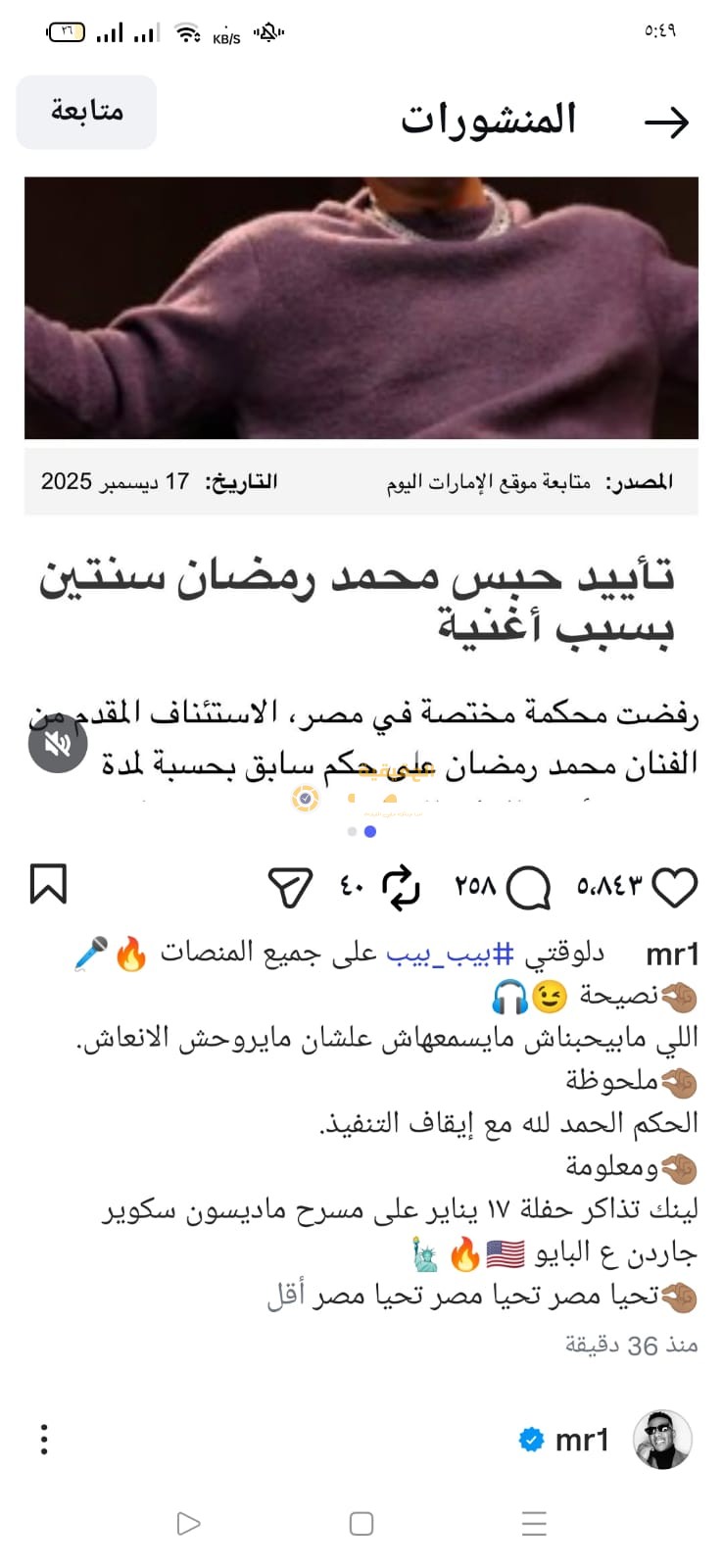 وبنبرة لم تخلو من التحدي، تجاهل رمضان تأثير الحكم على نشاطه الفني، حيث استغل المنشور للترويج لأحدث أعماله الغنائية قائلاً: “دلوقتي بيب بيب على جميع المنصات.. اللي مابيحبناش مايسمعهاش علشان مايروحش الإنعاش”.