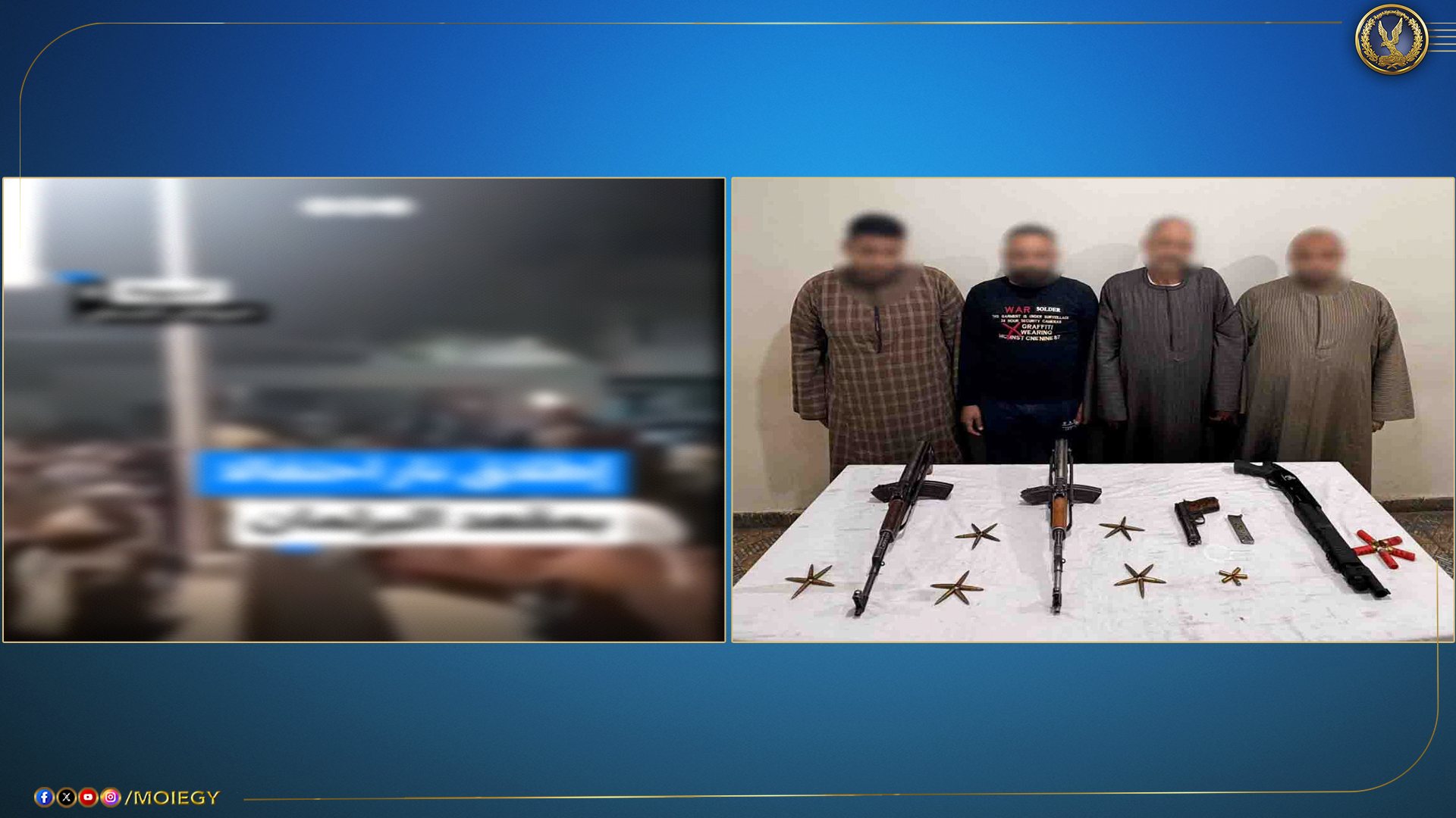 عقب تقنين الإجراءات، تم استهداف المتهمين في مأمورية أمنية ناجحة أسفرت عن ضبطهم جميعاً، وعثر بحوزتهم على الأسلحة المستخدمة في الفيديو، وهي عبارة عن: