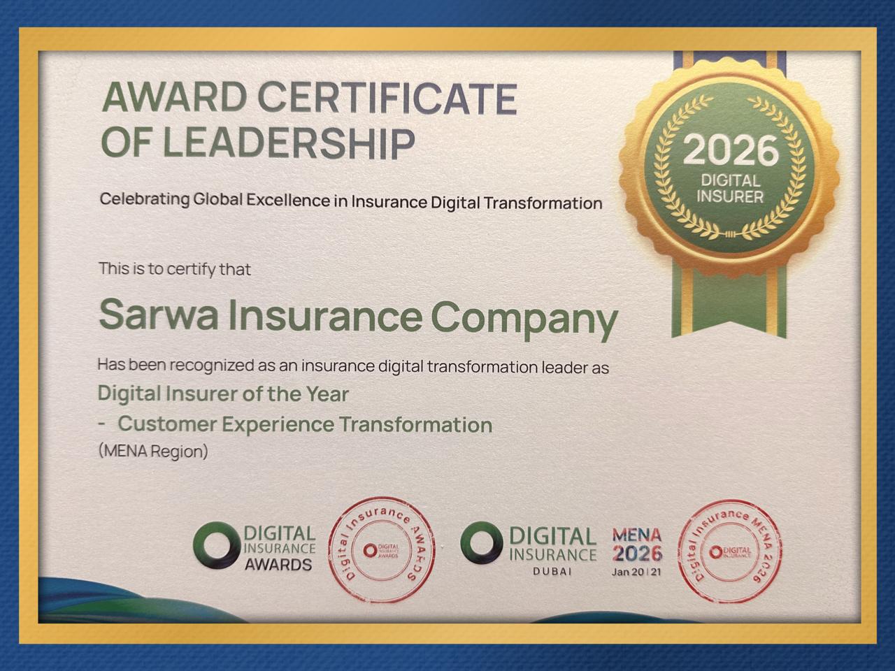 يأتي هذا التكريم كشهادة ل SarwaNow، كأول تطبيق في السوق المصري يقدم تجربة إصدار تأمين سيارات رقمية بالكامل للسيارات الجديدة الغير مرخصة كبداية لمرحلة جديدة في عالم التأمين الرقمي، معتمداً على تكنولوجيا متطورة تتيح للعملاء إتمام كافة الإجراءات من التسعير حتى إصدار الوثيقة فوراً عبر الهاتف المحمول، دون الحاجة لزيارة الفروع أو التعاملات الورقية.