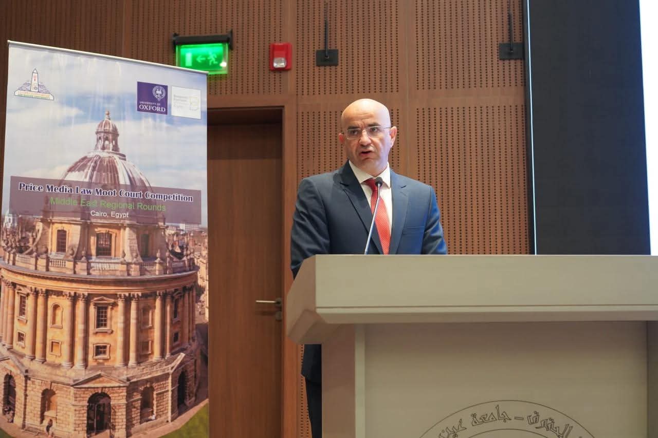 وخلال كلمته الافتتاحية، أعرب رئيس الجامعة عن فخره باستضافة هذا الحدث الإقليمي الكبير، مشيداً بالتعاون الاستراتيجي مع كبرى الجامعات العالمية. وأكد أن استضافة المسابقة بكلية الحقوق ومركز الابتكار بجامعة عين شمس (iHub) تعكس رؤية الجامعة في دمج التكنولوجيا والابتكار بالتعليم القانوني، مشيراً إلى أن الشراكة مع أكسفورد الممتدة منذ عام 2015، وانضمام جامعة كولومبيا كشريك أكاديمي للعام الثاني، يعكسان اهمية الحدث دولياً.