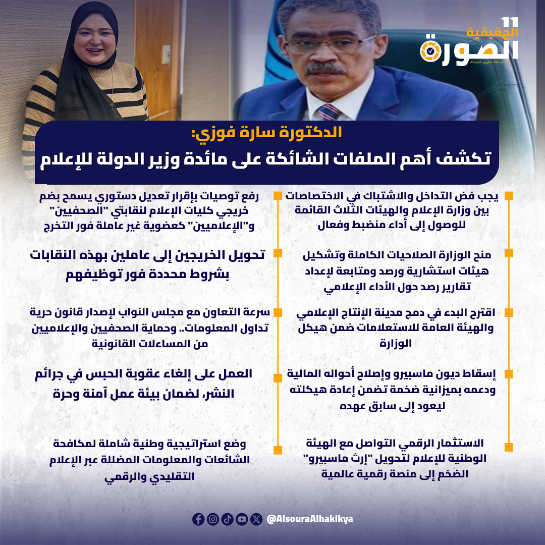 وطالبت أستاذ الإعلام بجامعة طنطا بضرورة أن تحظى عدد من الملفات باهتمام الوزير الجديد، وعلى رأسها التحول الرقمي، ووضع ميثاق أو تشريع أخلاقي ينظم النشر واستخدام مواقع التواصل الاجتماعي من قبل وسائل الإعلام، وتعزيز العملية الرقابة على الوسائل الإعلامية الإلكترونية المختلفة.