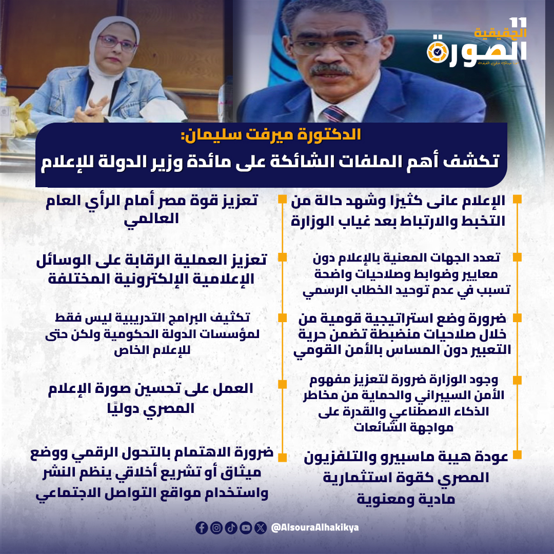 وأكدت سليمان في حديثها لـ الصورة الحقيقية، أن وجود الوزارة أصبح ضرورة لتعزيز مفهوم الأمن السيبراني والحماية من مخاطر الذكاء الاصطناعي، والقدرة على مواجهة الشائعات التي تستهدف الرأي العام، وذلك بما يتفق مع مصلحة الوطن والمواطنين، كما أن وجود هذه الوزارة يساعد في تعزيز قوة مصر أمام الرأي العام العالمي وعودة هيبة ماسبيرو والتلفزيون المصري كقوة استثمارية مادية ومعنوية ومواجهة ما يتسهدف الهوية والثقافة الوطنية.