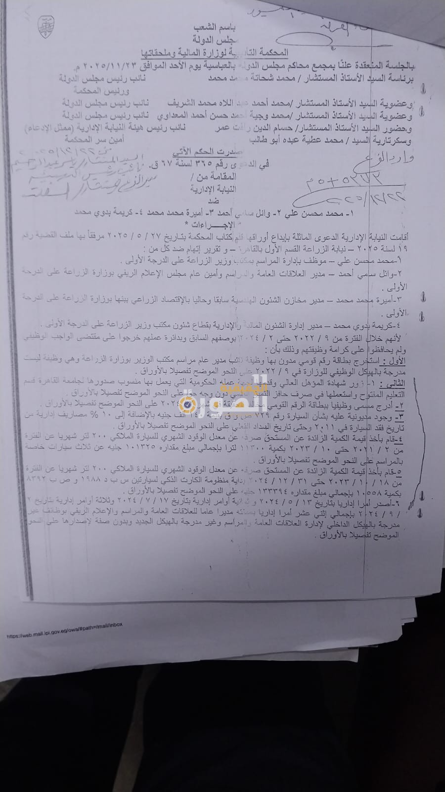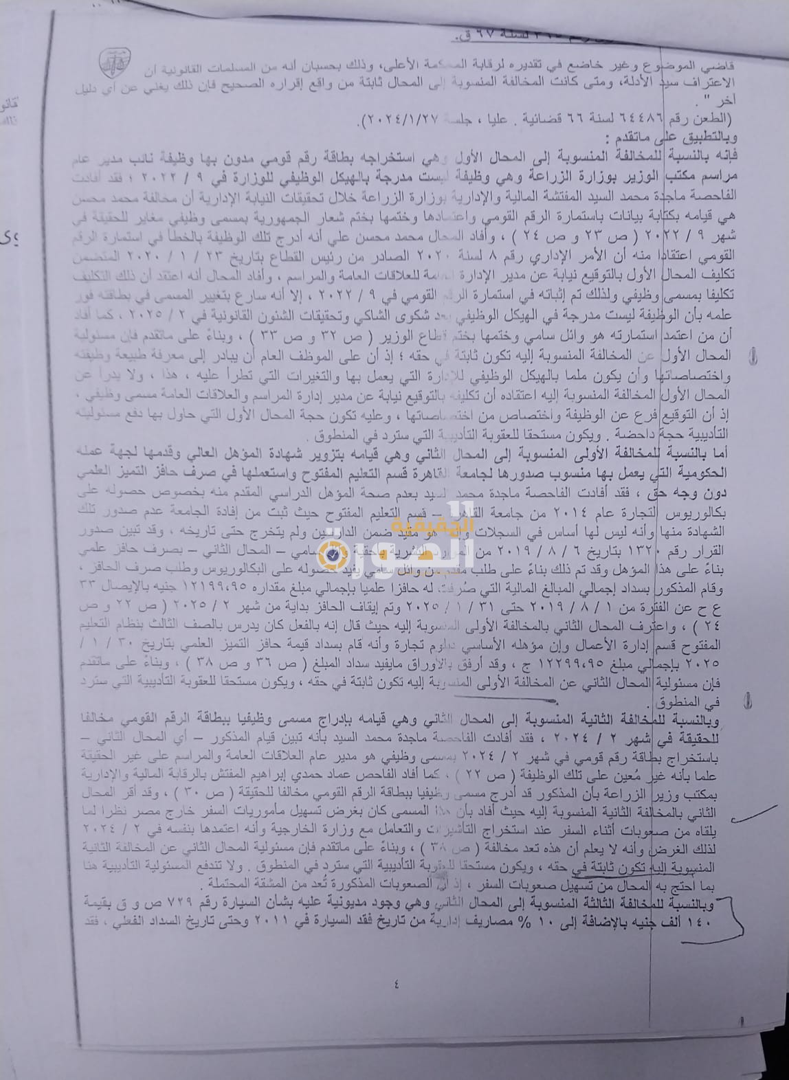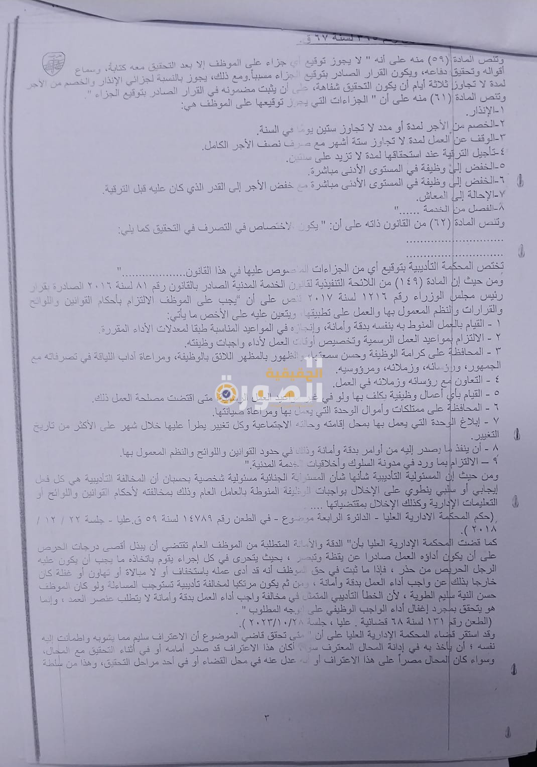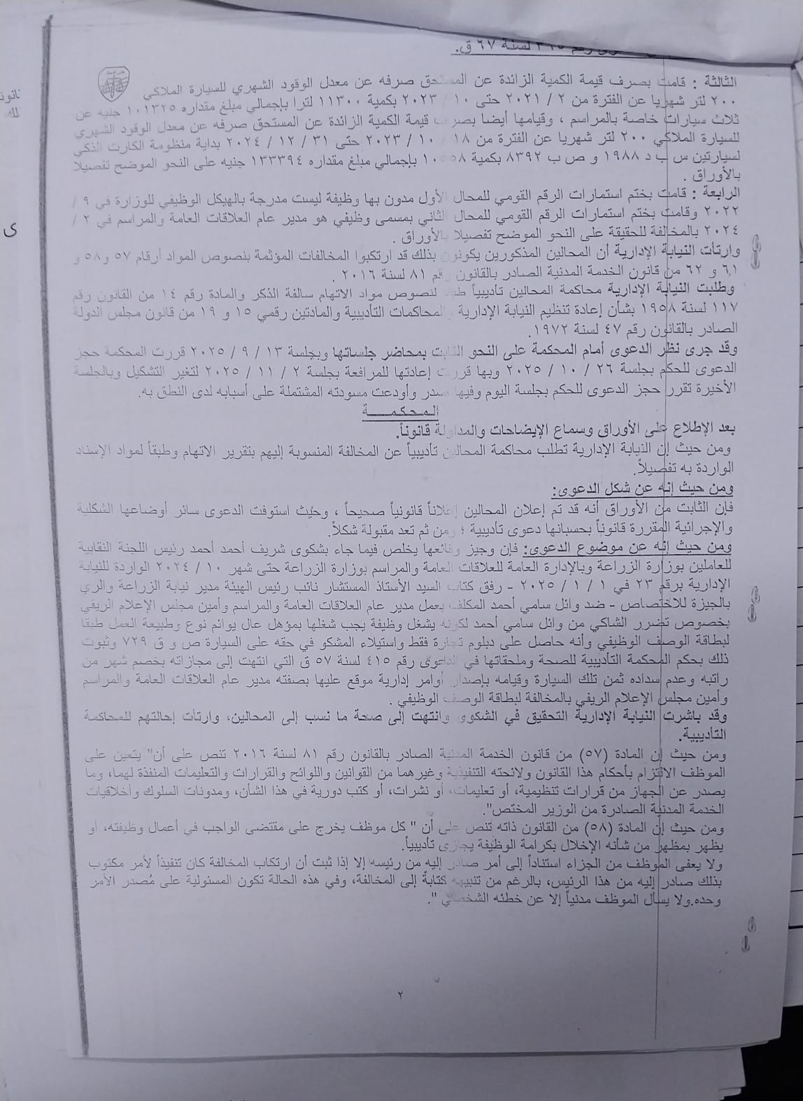 قضت المحكمة التأديبية لوزارة المالية وملحقاتها، برئاسة المستشار محمد شحاتة، وعضوية المستشارين محمد أحمد ومحمد وجيه، وبحضور المستشار حسام الدين رأفت ممثل النيابة الإدارية، بحكم رادع في القضية رقم 1365 لسنة 67 ق، ضد عدد من مسؤولي قطاع مكتب وزير الزراعة، إثر تورطهم في وقائع تزوير مادية ومعنوية شملت مؤهلات دراسية وبطاقات هوية للاستيلاء على مسميات وظيفية غير حقيقية.