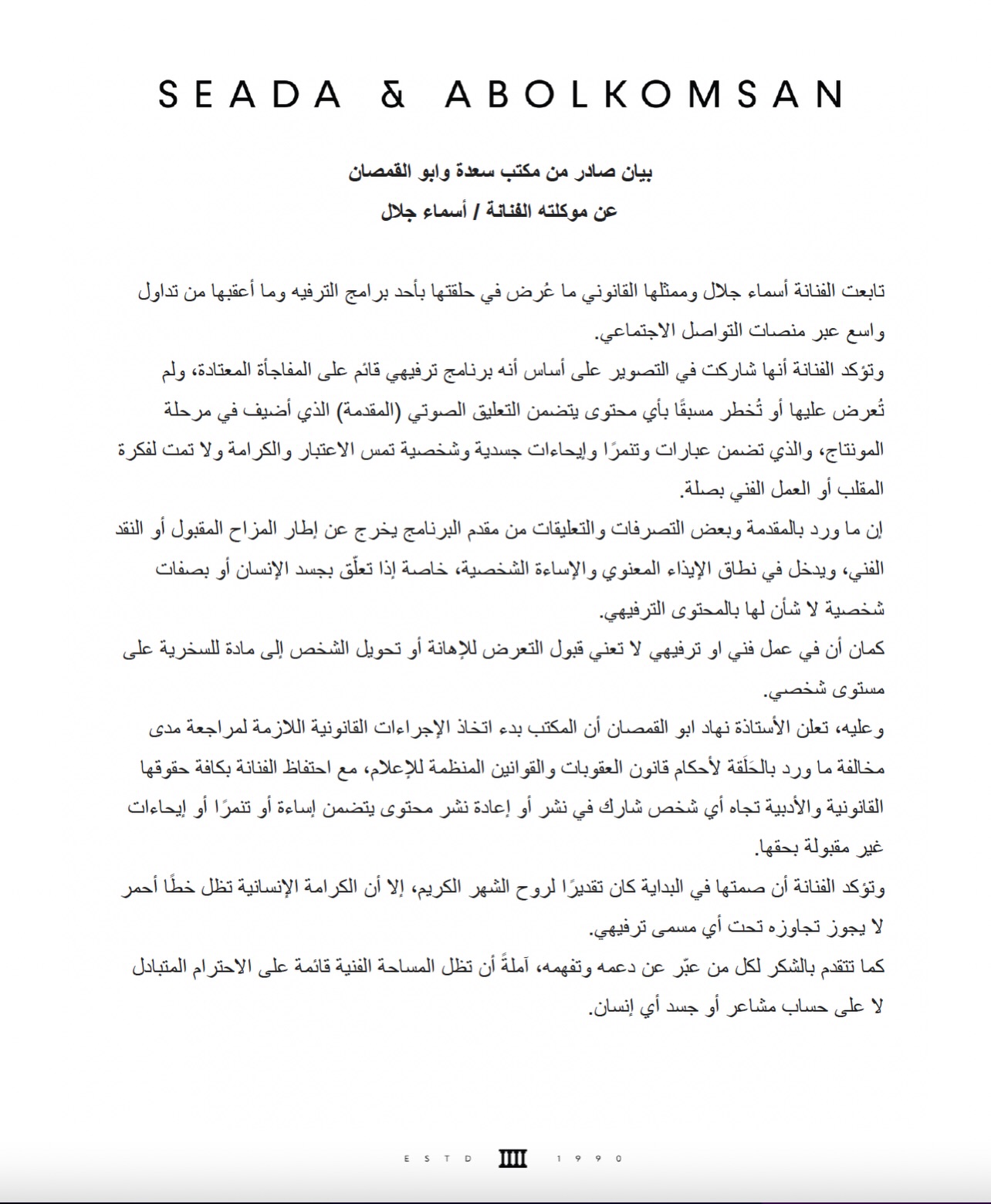 وأصدر مكتب “سعدة وأبو القمصان”، الممثل القانوني للفنانة، بياناً شديد اللهجة أعلن فيه بدء اتخاذ الإجراءات القانونية اللازمة حيال ما وصفه بـ “الإساءات والتجاوزات” التي شهدتها الحلقة.