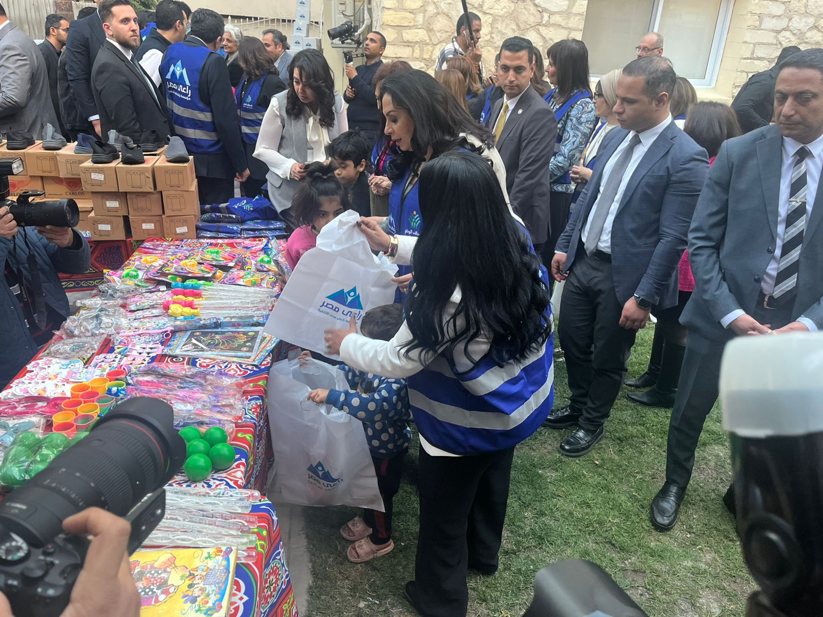 وشارك في التوزيع كل من الدكتورة مايا مرسي وزيرة التضامن الاجتماعي، والسفيرة نبيلة مكرم رئيس الأمانة الفنية للتحالف الوطني، والدكتور إبراهيم صابر محافظ القاهرة، والدكتورة هالة زايد وزيرة الصحة الأسبق، ونيفين إسكندر وزيرة البيئة الأسبق، والسفيرة سها جندي وزيرة الهجرة السابقة، والفنانة إلهام شاهين، والفنانة لبلبة، والفنان هاني رمزي، إلى جانب عدد من الشخصيات العامة.