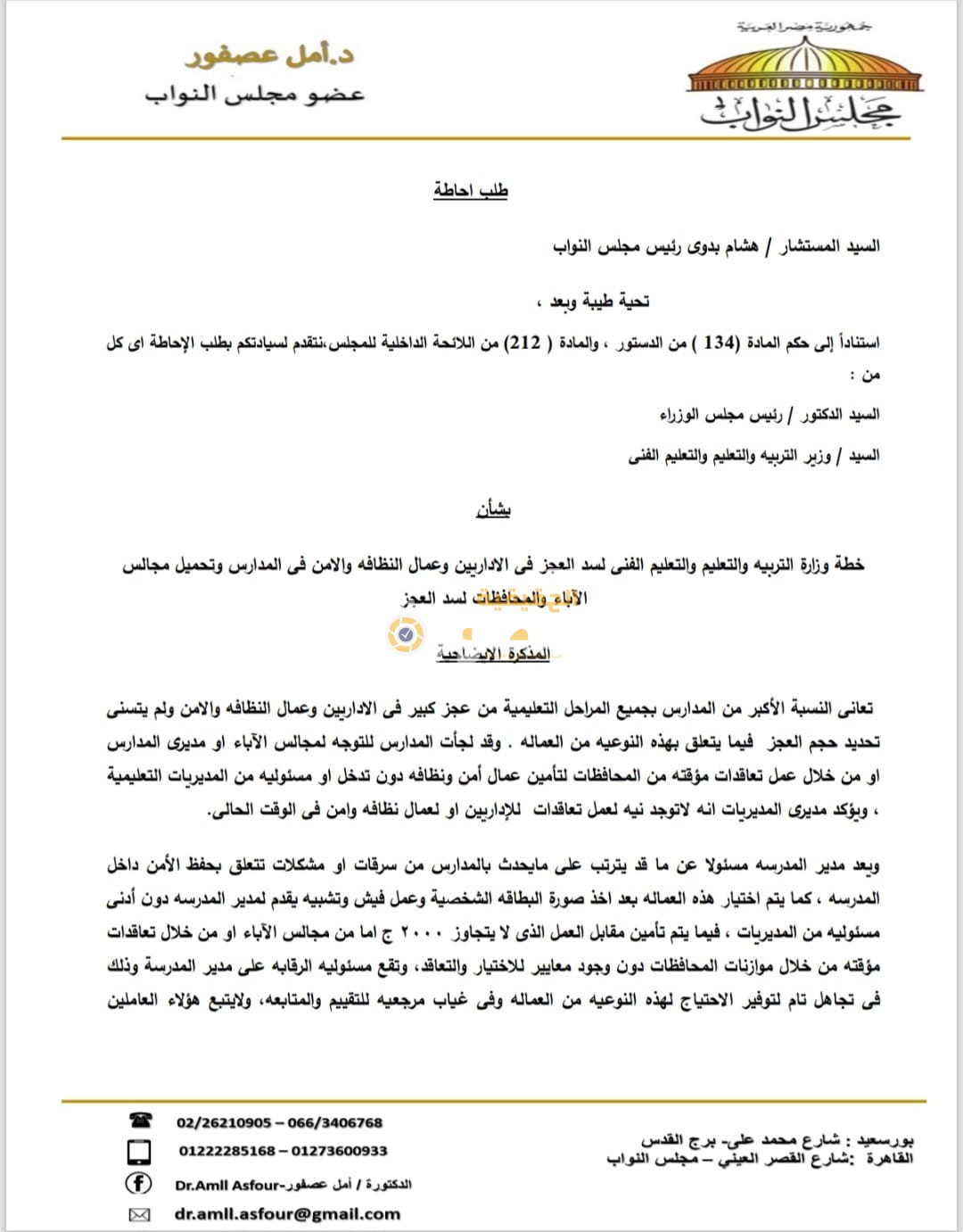 تقدمت النائبة أمل عصفور، عضو لجنة التعليم بمجلس النواب، أمين أمانة الشؤون البرلمانية بحزب الشعب الجمهوري بطلب إحاطة موجه إلى رئيس مجلس الوزراء ووزير التربية والتعليم والتعليم الفني، بشأن خطة الوزارة لسد العجز في الإداريين وعمال النظافة والأمن داخل المدارس، وما ترتب على ذلك من تحميل مجالس الآباء والمحافظات أعباء سد هذا العجز.