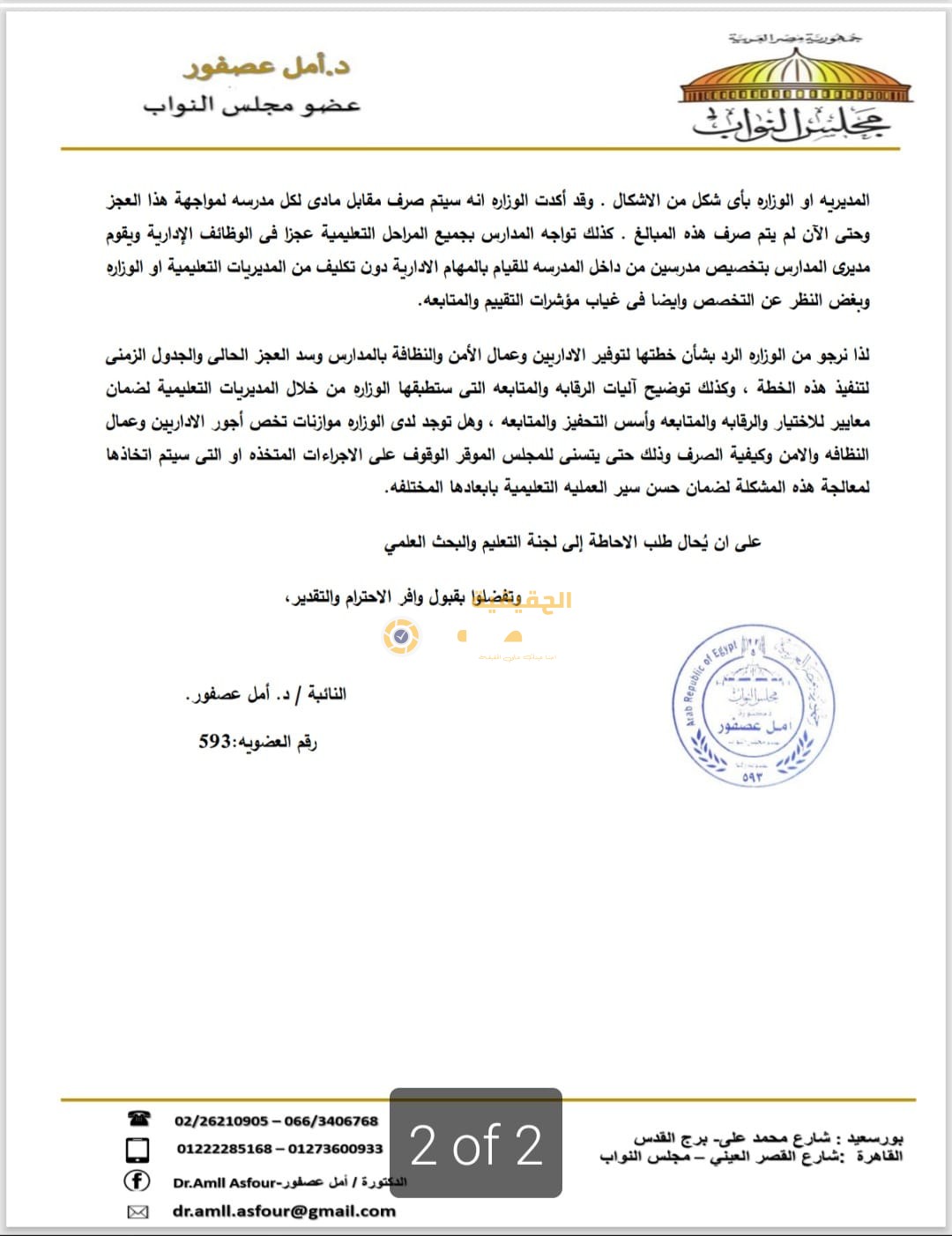 الكلمات المفتاحية : أمل عصفوراخبار التعليمالتعليممجلس الشيوخمجلس النواب
