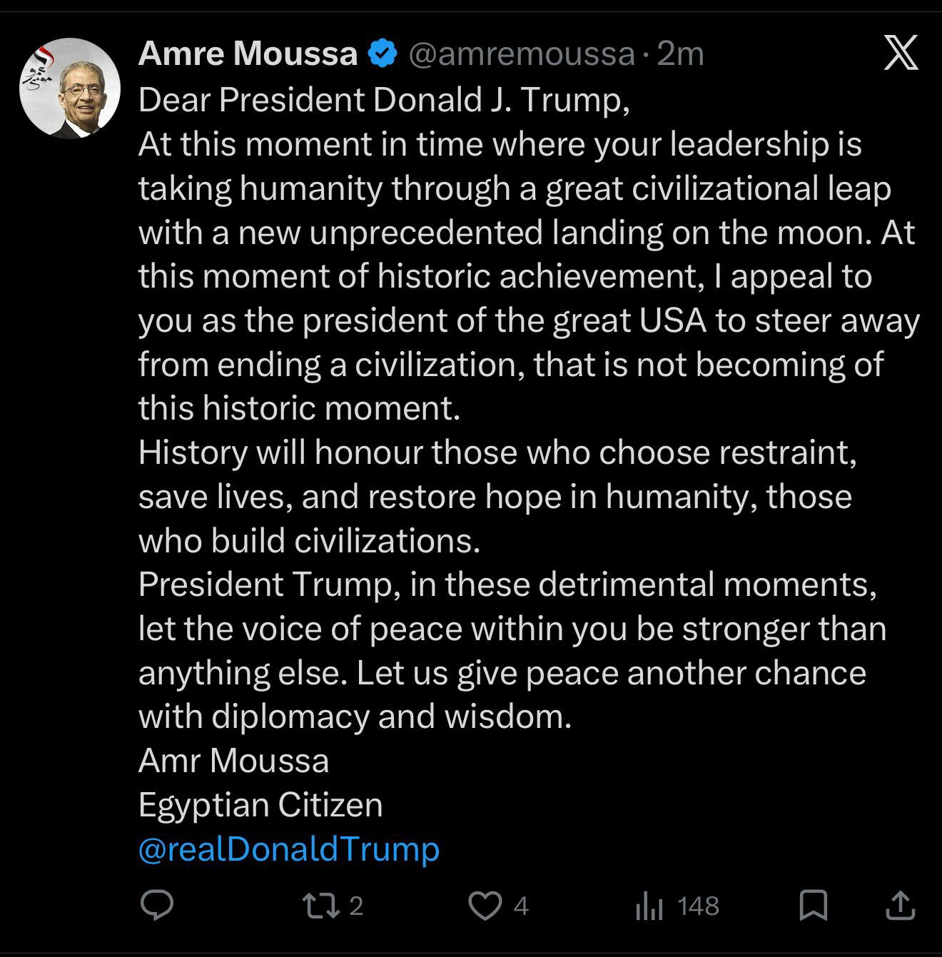 وجه السيد عمرو موسى، الأمين العام الأسبق لجامعة الدول العربية ووزير الخارجية المصري الأسبق، رسالة مفتوحة وشديدة اللهجة في مضامينها الإنسانية إلى رئيس الولايات المتحدة الأمريكية، دونالد ج. ترامب، تزامناً مع الإنجازات العلمية الكبرى التي تشهدها البشرية في مجال غزو الفضاء والهبوط الجديد على سطح القمر.