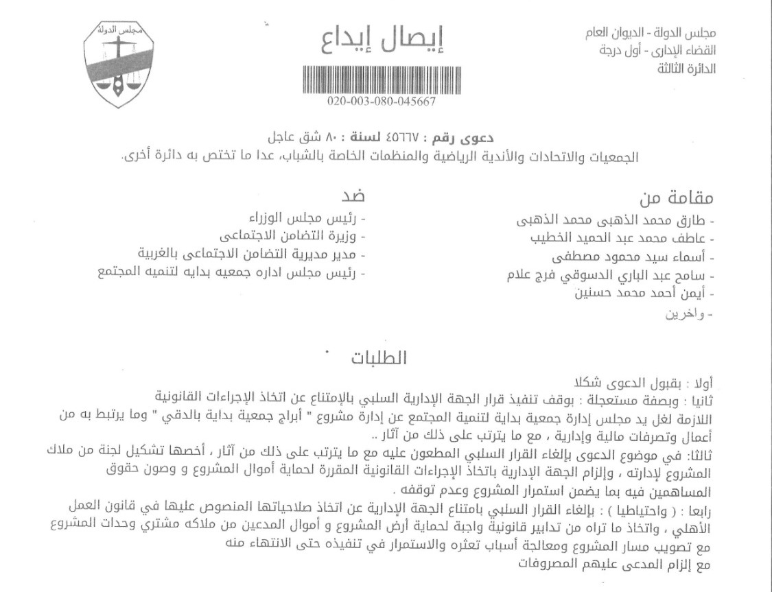 أقام عدد من حاجزي ومشتري وحدات مشروع «أبراج جمعية بداية بالدقي» دعوى قضائية أمام محكمة القضاء الإداري بمجلس الدولة، حملت رقم 45667 لسنة 80 قضائية (شق عاجل)، طالبوا فيها بوقف تنفيذ «القرار الإداري السلبي» الصادر عن الجهات المختصة بالامتناع عن اتخاذ الإجراءات القانونية اللازمة لغل يد مجلس إدارة الجمعية عن إدارة المشروع.